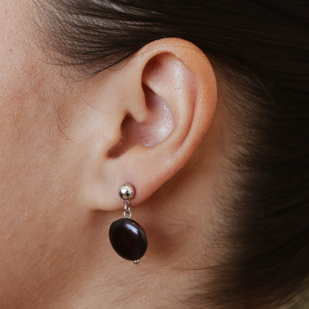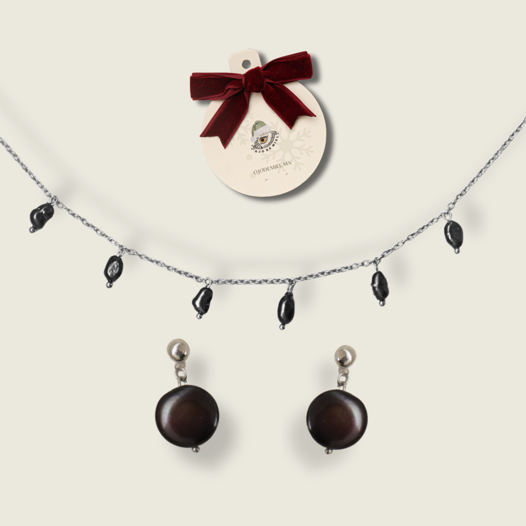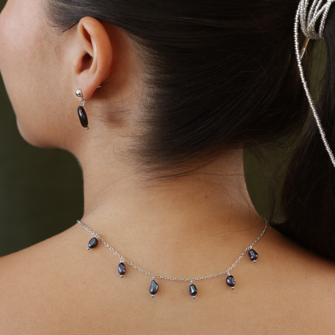 MATERIAL: layer cadena de acero con perla natural en azul tornasol, arete chapa de rodio con perla natural moneda color azul tornasol.