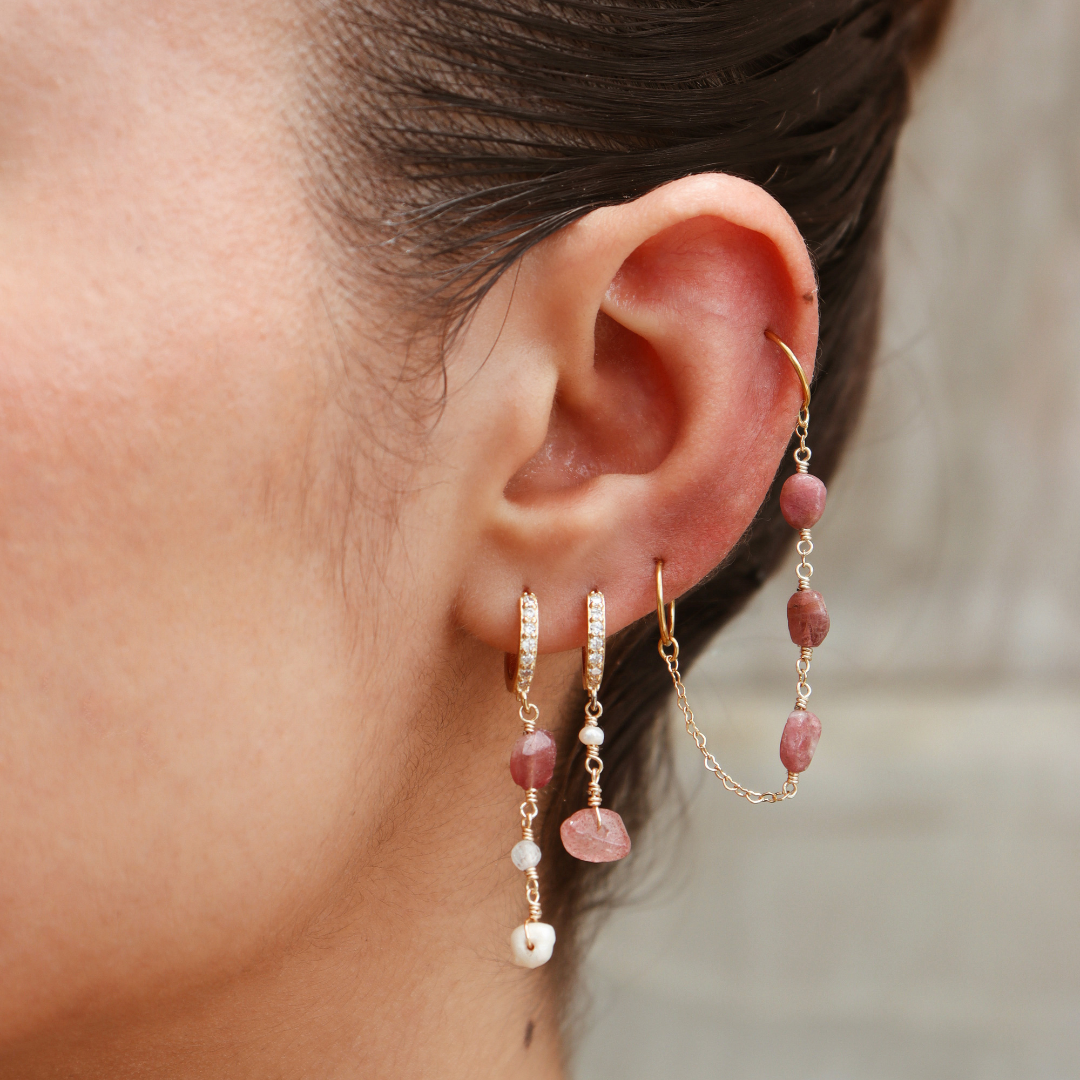 MEDIDAS: largo de cadena 6 cm, primer huggie 1.1 cm de diámetro y 3 cm largo de dije, segundo huggie 1.1 cm de diámetro y 1.5 largo de dije.
